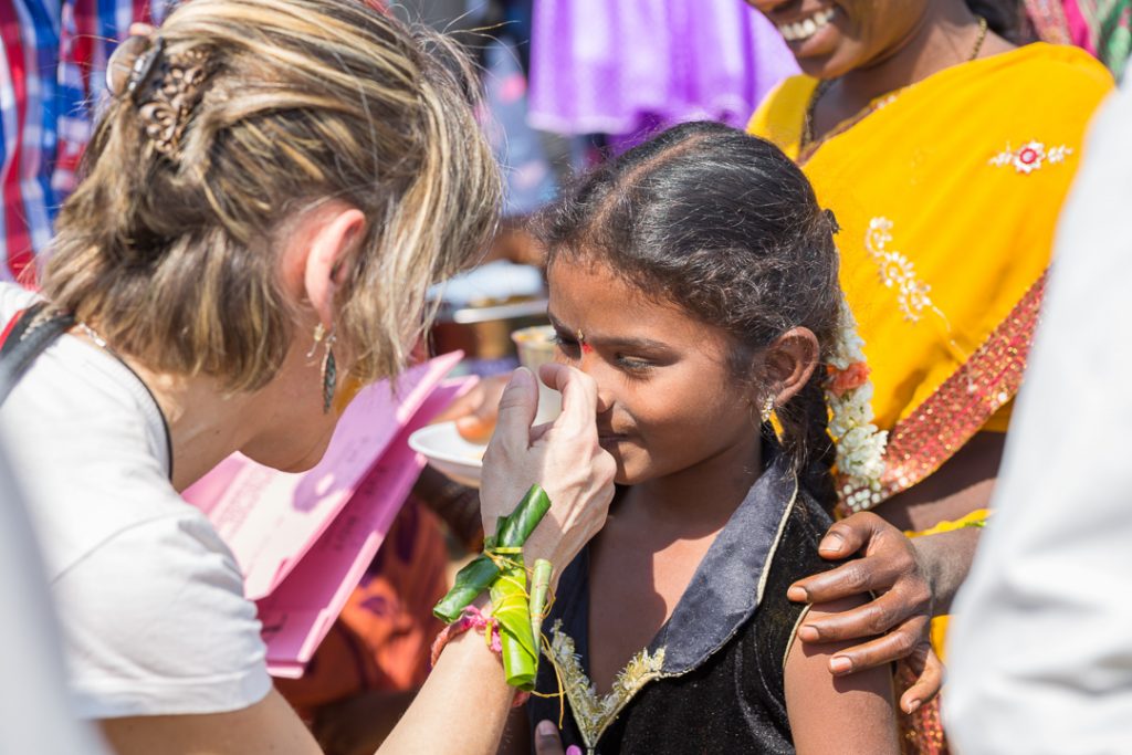 Entramos en la aldea, esta vez, sin comité de bienvenida. Me sorprendió, porque en cada viaje, el pueblo entero nos esperaba en la entrada, con esos collares de flores, las pulseras, el bindi en la frente, ese punto rojo que te pintan en la zona del tercer ojo, como señal de bienvenida. El bindi es un simbolo de energia y sabiduría.